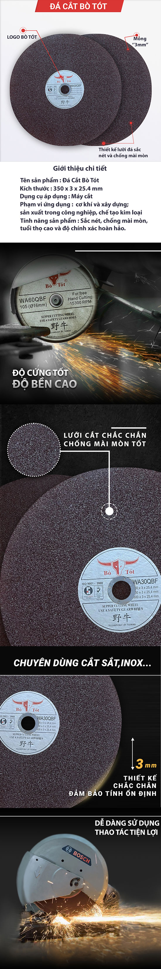 Mô tả – Đá cắt Bò tót là sản phẩm cao cấp trên thị trường với các thương hiệu đá cắt hiện nay, sản phẩm được tin dùng ở đa phần là khách hàng cá nhân, cơ sở sản xuất nhỏ lẻ bởi thiết kế siêu mỏng nhưng lực cắt rất bén, bề mặt cắt sản phẩm đẹp tạo nên tính thẩm mĩ hơn cho các nguyên liệu và khâu chế tác sản phẩm – Thiết kế sản phẩm đá cắt Bò tót vừa đơn giản vừa tiện lợi, giúp khách hàng dễ dàng đọc thông tin trên nhãn hiệu: ký hiệu bảo hộ,...