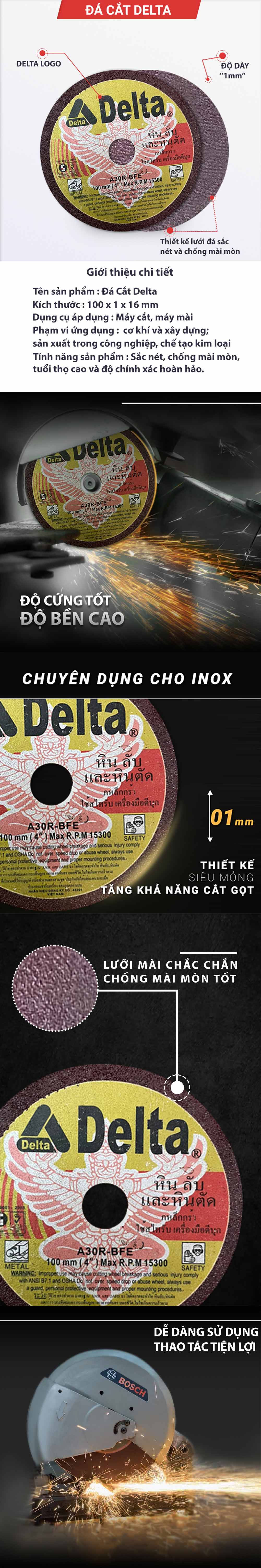 Mô tả – Đá cắt DELTA là sản phẩm cao cấp trên thị trường với các thương hiệu đá cắt hiện nay, sản phẩm được tin dùng ở đa phần là khách hàng cá nhân, cơ sở sản xuất nhỏ lẻ bởi thiết kế siêu mỏng nhưng lực cắt rất bén, bề mặt cắt sản phẩm đẹp tạo nên tính thẩm mĩ hơn cho các nguyên liệu và khâu chế tác sản phẩm – Thiết kế sản phẩm đá cắt Delta vừa đơn giản vừa tiện lợi, giúp khách hàng dễ dàng đọc thông tin trên nhãn hiệu: ký hiệu bảo hộ,...