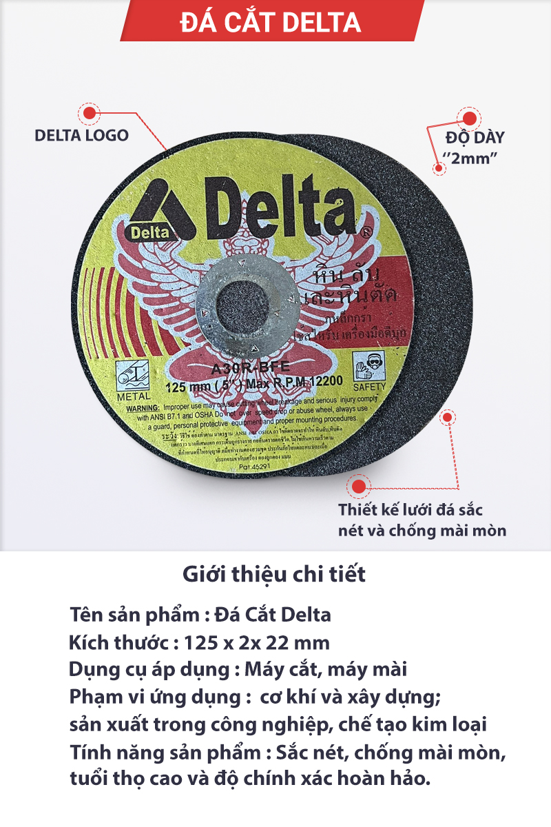 Mô tả – Đá cắt DELTA là sản phẩm cao cấp trên thị trường với các thương hiệu đá cắt hiện nay, sản phẩm được tin dùng ở đa phần là khách hàng cá nhân, cơ sở sản xuất nhỏ lẻ bởi thiết kế siêu mỏng nhưng lực cắt rất bén, bề mặt cắt sản phẩm đẹp tạo nên tính thẩm mĩ hơn cho các nguyên liệu và khâu chế tác sản phẩm – Thiết kế sản phẩm đá cắt Delta vừa đơn giản vừa tiện lợi, giúp khách hàng dễ dàng đọc thông tin trên nhãn hiệu: ký hiệu bảo hộ,...