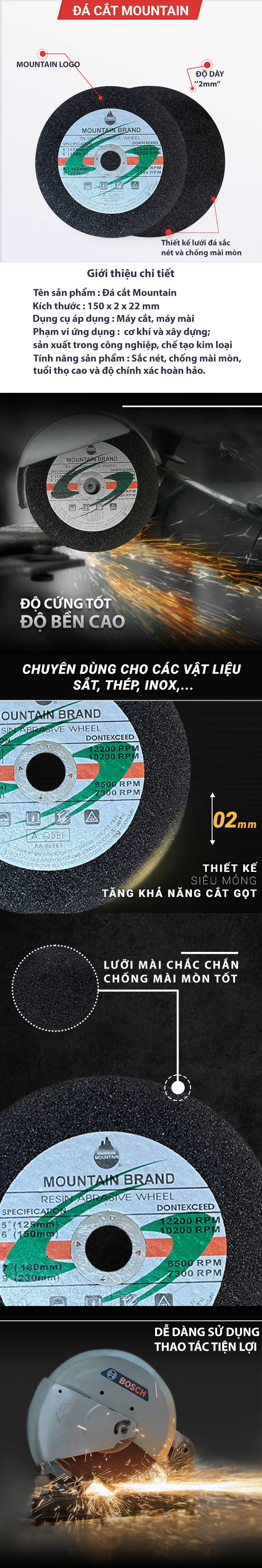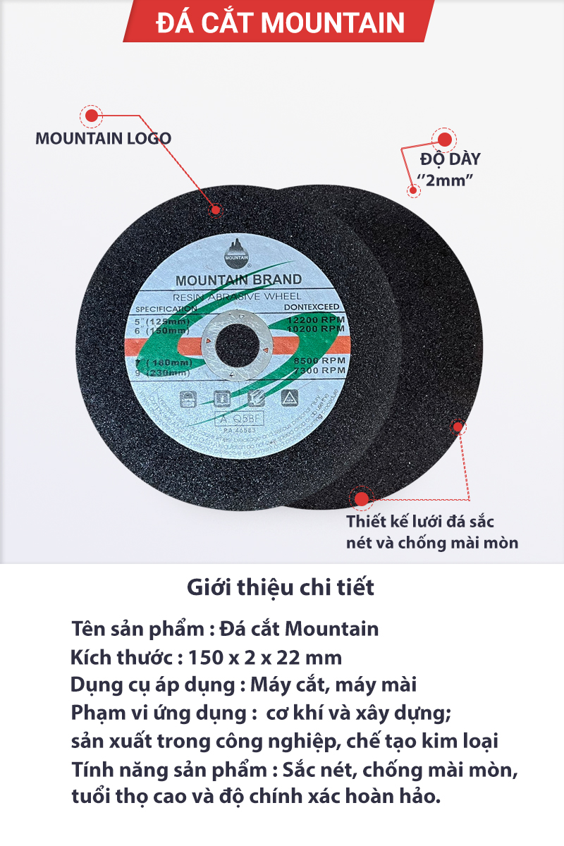 Mô tả – Đá cắt MOUNTAIN là sản phẩm cao cấp trên thị trường với các thương hiệu đá cắt hiện nay, sản phẩm được tin dùng ở đa phần là khách hàng cá nhân, cơ sở sản xuất nhỏ lẻ bởi thiết kế siêu mỏng nhưng lực cắt rất bén, bề mặt cắt sản phẩm đẹp tạo nên tính thẩm mĩ hơn cho các nguyên liệu và khâu chế tác sản phẩm – Thiết kế sản phẩm đá cắt Mountain vừa đơn giản vừa tiện lợi, giúp khách hàng dễ dàng đọc thông tin trên nhãn hiệu: ký hiệu bảo hộ,...