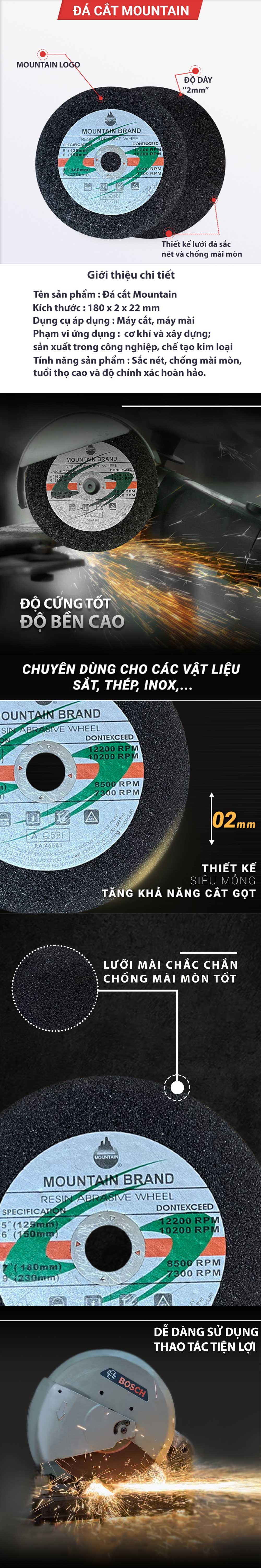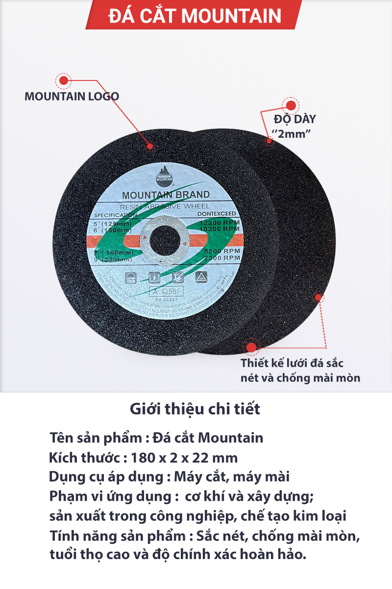 Mô tả – Đá cắt MOUNTAIN là sản phẩm cao cấp trên thị trường với các thương hiệu đá cắt hiện nay, sản phẩm được tin dùng ở đa phần là khách hàng cá nhân, cơ sở sản xuất nhỏ lẻ bởi thiết kế siêu mỏng nhưng lực cắt rất bén, bề mặt cắt sản phẩm đẹp tạo nên tính thẩm mĩ hơn cho các nguyên liệu và khâu chế tác sản phẩm – Thiết kế sản phẩm đá cắt Mountain vừa đơn giản vừa tiện lợi, giúp khách hàng dễ dàng đọc thông tin trên nhãn hiệu: ký hiệu bảo hộ,...