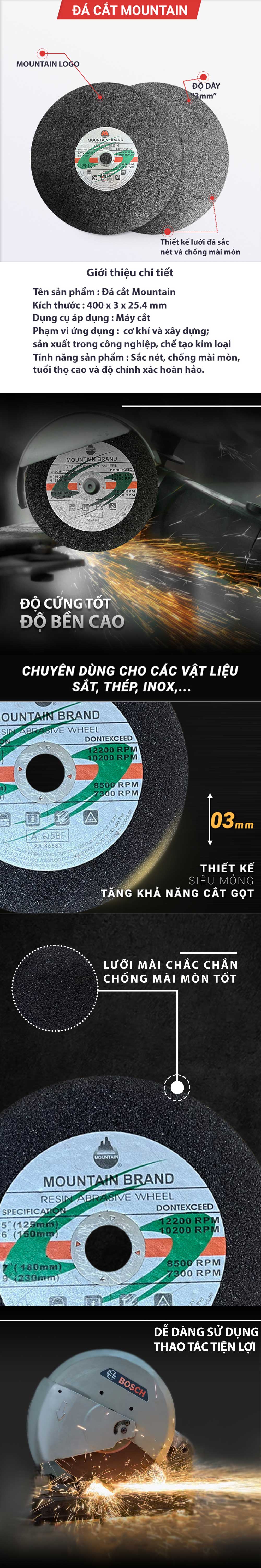 Mô tả – Đá cắt MOUNTAIN là sản phẩm cao cấp trên thị trường với các thương hiệu đá cắt hiện nay, sản phẩm được tin dùng ở đa phần là khách hàng cá nhân, cơ sở sản xuất nhỏ lẻ bởi thiết kế siêu mỏng nhưng lực cắt rất bén, bề mặt cắt sản phẩm đẹp tạo nên tính thẩm mĩ hơn cho các nguyên liệu và khâu chế tác sản phẩm – Thiết kế sản phẩm đá cắt Mountain vừa đơn giản vừa tiện lợi, giúp khách hàng dễ dàng đọc thông tin trên nhãn hiệu: ký hiệu bảo hộ,...