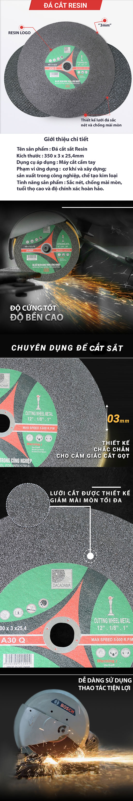 Mô tả – Đá cắt RESIN là sản phẩm cao cấp trên thị trường với các thương hiệu đá cắt hiện nay, sản phẩm được tin dùng ở đa phần là khách hàng cá nhân, cơ sở sản xuất nhỏ lẻ bởi thiết kế siêu mỏng nhưng lực cắt rất bén, bề mặt cắt sản phẩm đẹp tạo nên tính thẩm mĩ hơn cho các nguyên liệu và khâu chế tác sản phẩm – Thiết kế sản phẩm đá cắt RESIN vừa đơn giản vừa tiện lợi, giúp khách hàng dễ dàng đọc thông tin trên nhãn hiệu: ký hiệu bảo hộ,...