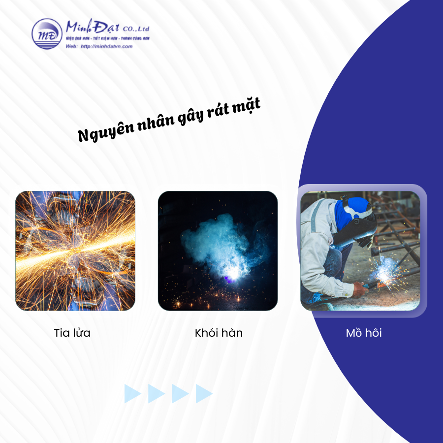 • Thời gian tiếp xúc: Thời gian tiếp xúc với tia lửa, khói hàn càng lâu thì nguy cơ bị rát mặt càng cao.