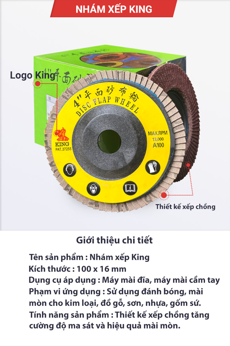 Nhám xếp King thường được sử dụng trong các ứng dụng gia công kim loại, chẳng hạn như mài và đánh bóng bề mặt thép không gỉ, nhôm, đồng, đồng thau và các hợp kim khác. Nó cũng được sử dụng trong các ứng dụng chế tạo gỗ, như mài và đánh bóng bề mặt đồ gỗ, đồ nội thất, ván ép và các vật liệu khác.