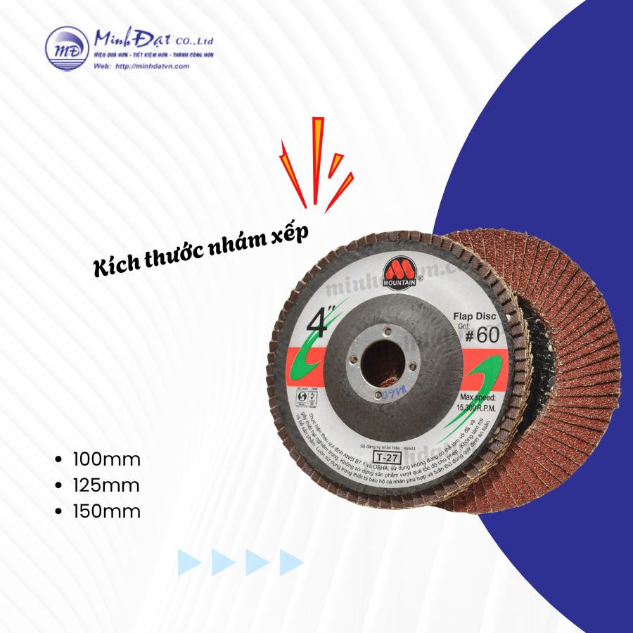 4. Đa Dạng Kích Thước Nhám xếp Moutain cung cấp các kích thước phổ biến như 100mm, 125mm, và 150mm, giúp bạn lựa chọn sản phẩm phù hợp với yêu cầu công việc cụ thể. Dù là công việc mài chi tiết hay xử lý bề mặt rộng, nhám xếp Moutain đều có giải pháp lý tưởng.