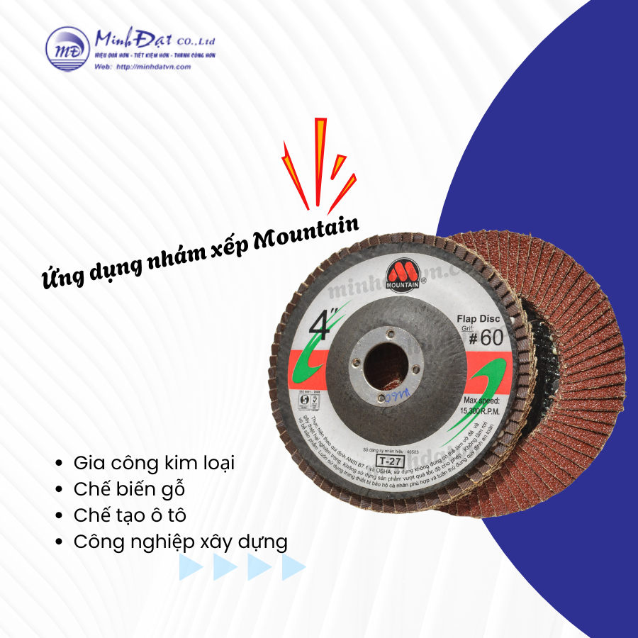 3. Ứng Dụng Đa Dạng Nhám xếp Moutain có thể sử dụng cho nhiều ứng dụng khác nhau, từ mài mòn kim loại, gỗ, đến các vật liệu khó xử lý. Dù là công việc mài phá thô, mài mịn hay đánh bóng, nhám xếp Moutain đều đáp ứng tốt nhu cầu công việc.